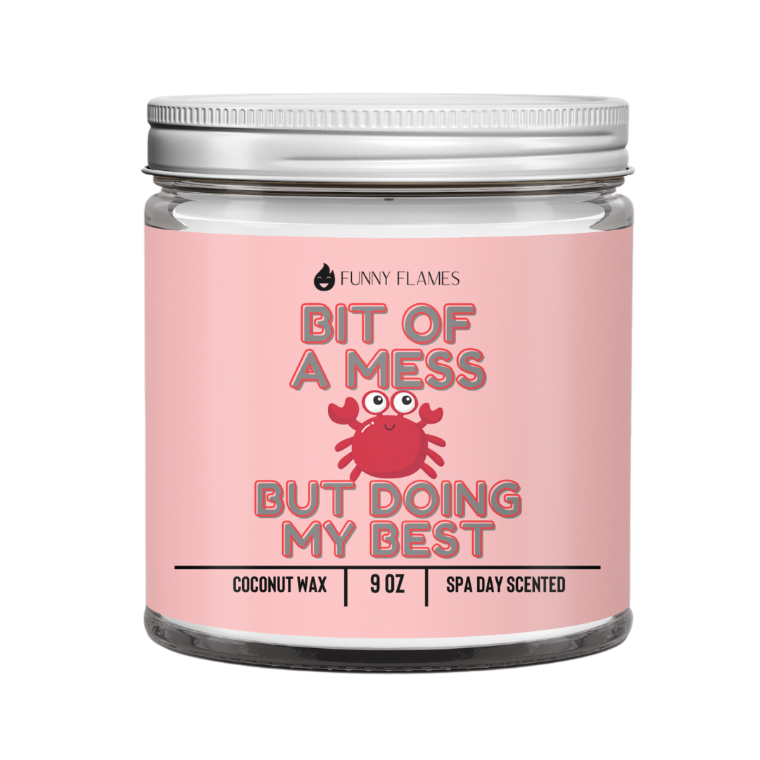 The candle that celebrates self-care and embracing life's imperfections. Infused with a soothing spa day scent, this candle envelops you in the calming aromas of eucalyptus, lavender, and hints of rejuvenating citrus. Its endearing name serves as a gentle reminder that it's okay to take a moment for yourself and find solace in the midst of life's challenges. Light up this candle to create a serene atmosphere, providing yourself with a well-deserved moment of relaxation and self-compassion. 'A Bit Of A Mess, But Doing My Best' is the perfect companion for those seeking balance and peace in the chaos of everyday life.